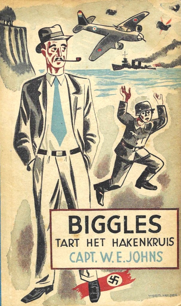 Biggles Tart het hakenkruis (1946), 1e druk, geïllustreerd door Wim van Beek.